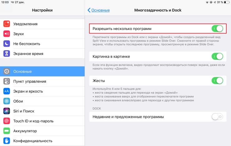 Но, если вдруг вы почувствуете необходимость в запуске нескольких приложений сразу, вернитесь в раздел «Многозадачность и Dock» и активируйте отключенный ранее параметр заново.